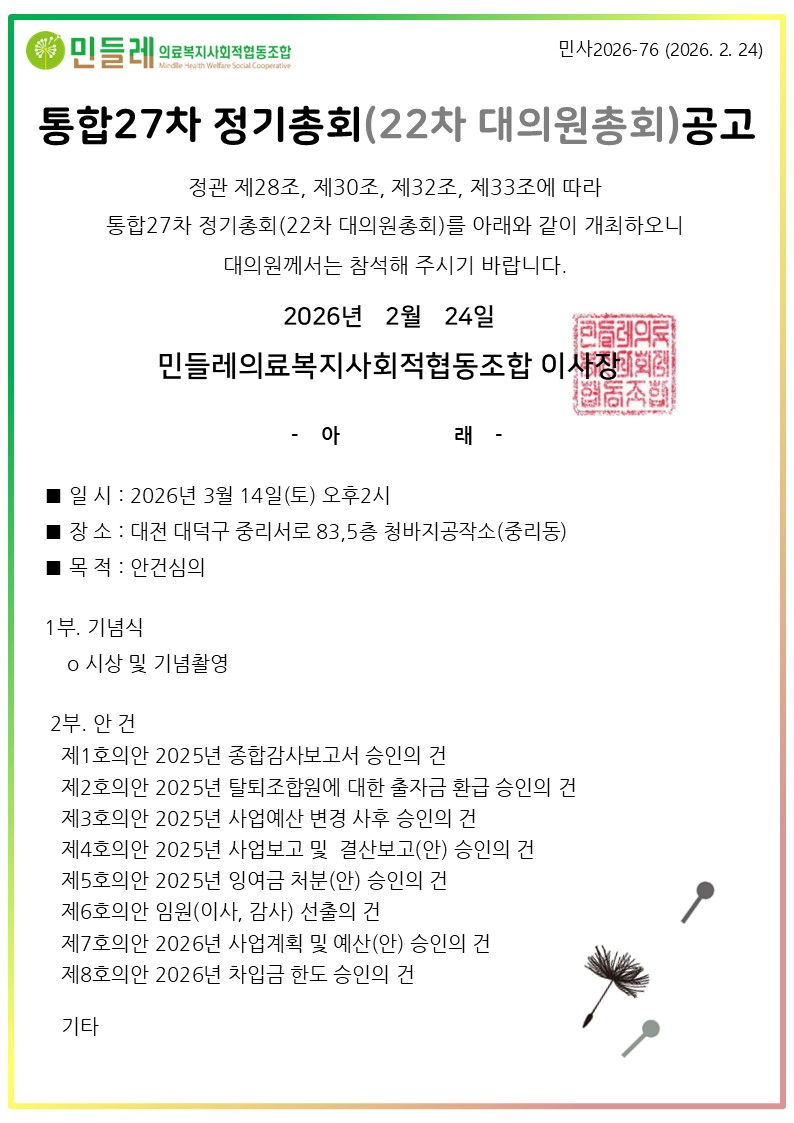 통합27차 정기총회(22차 대의원총회) 공고