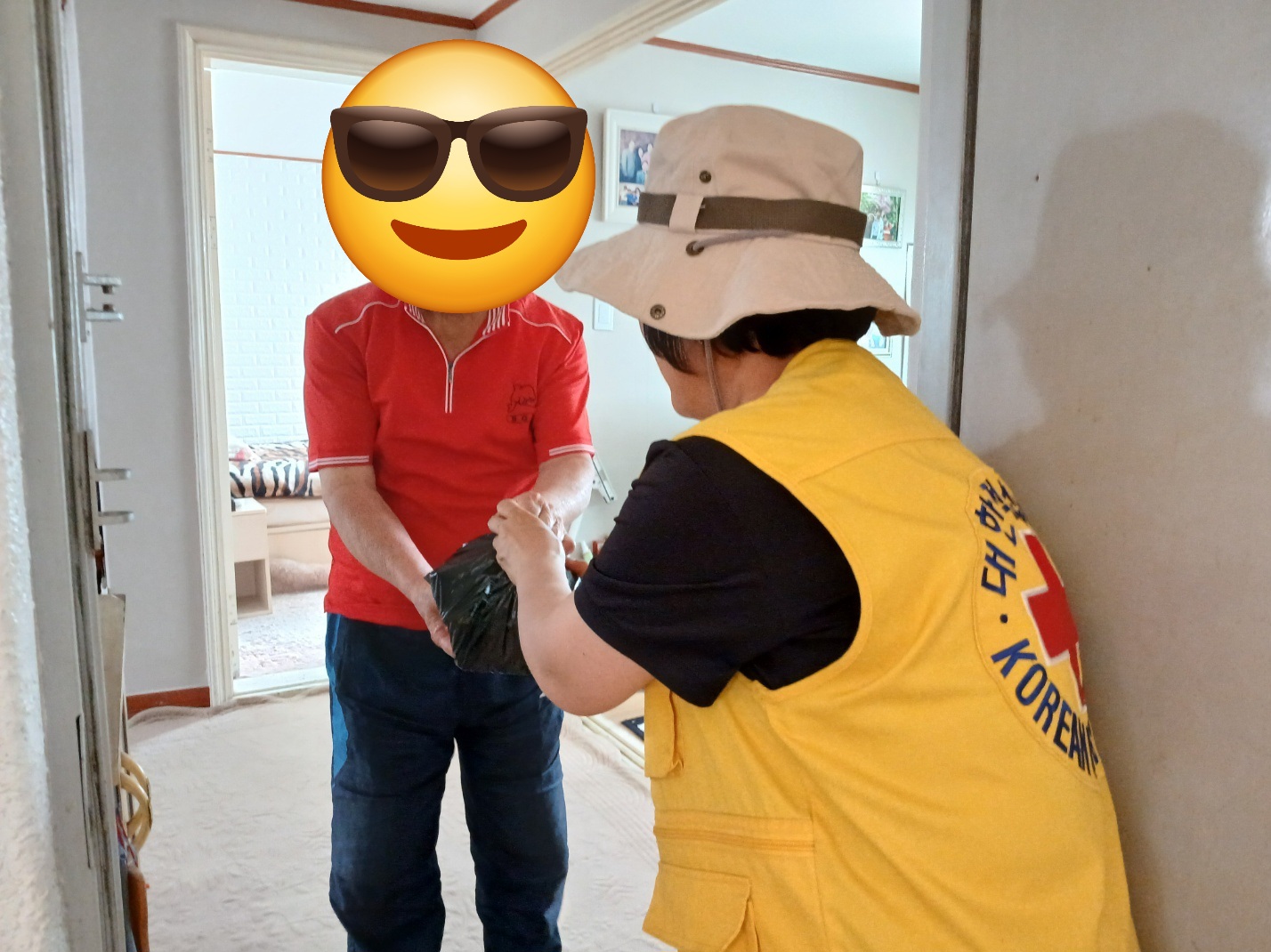 매주 화요일에는 적십자 상징인 노란 조끼를 입고 활동을 합니다. 존중하며 건강하게 대상자집을 방문을 해 면담도 하면서 일일이 대상자를 살피고 있습니다