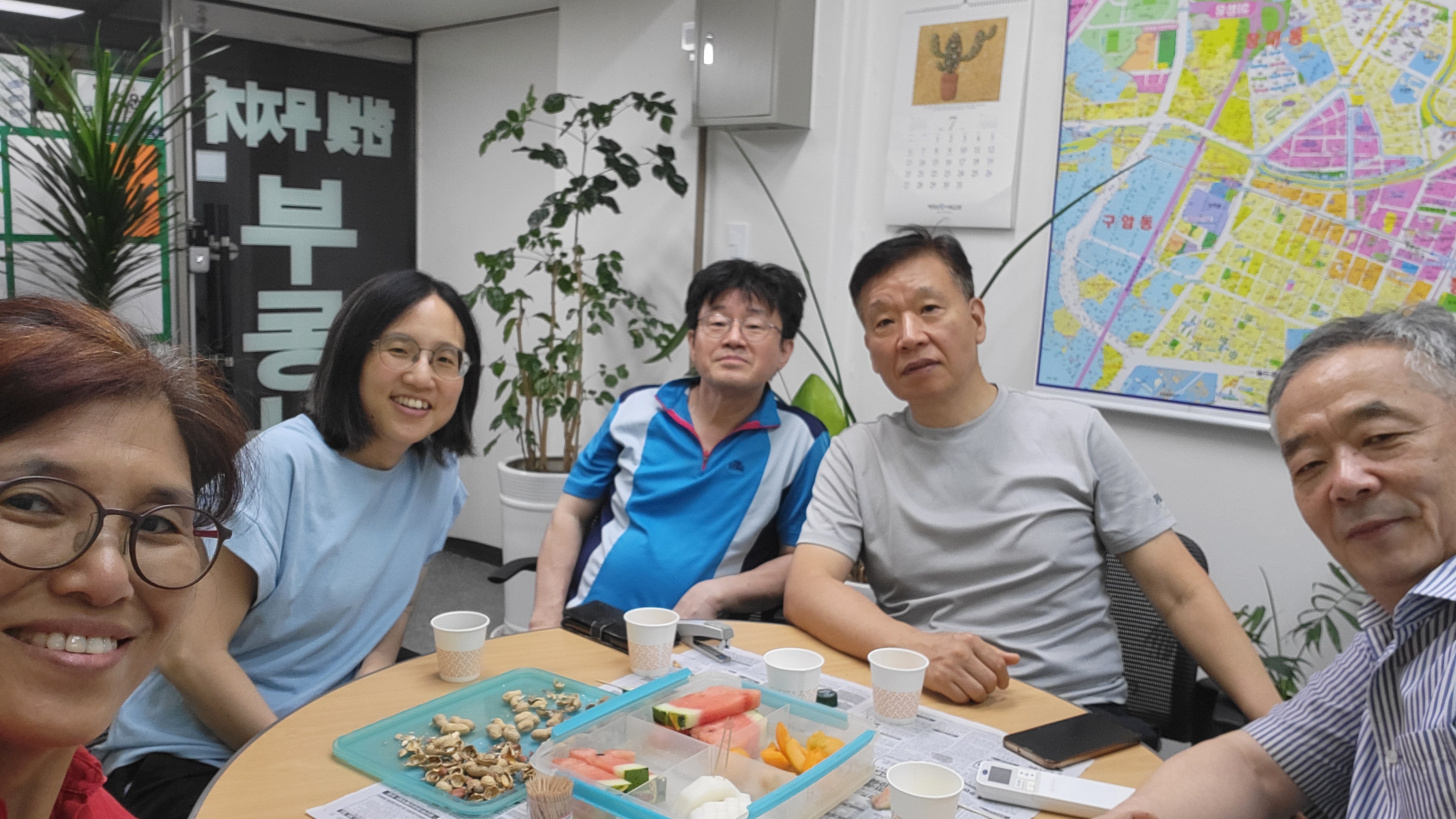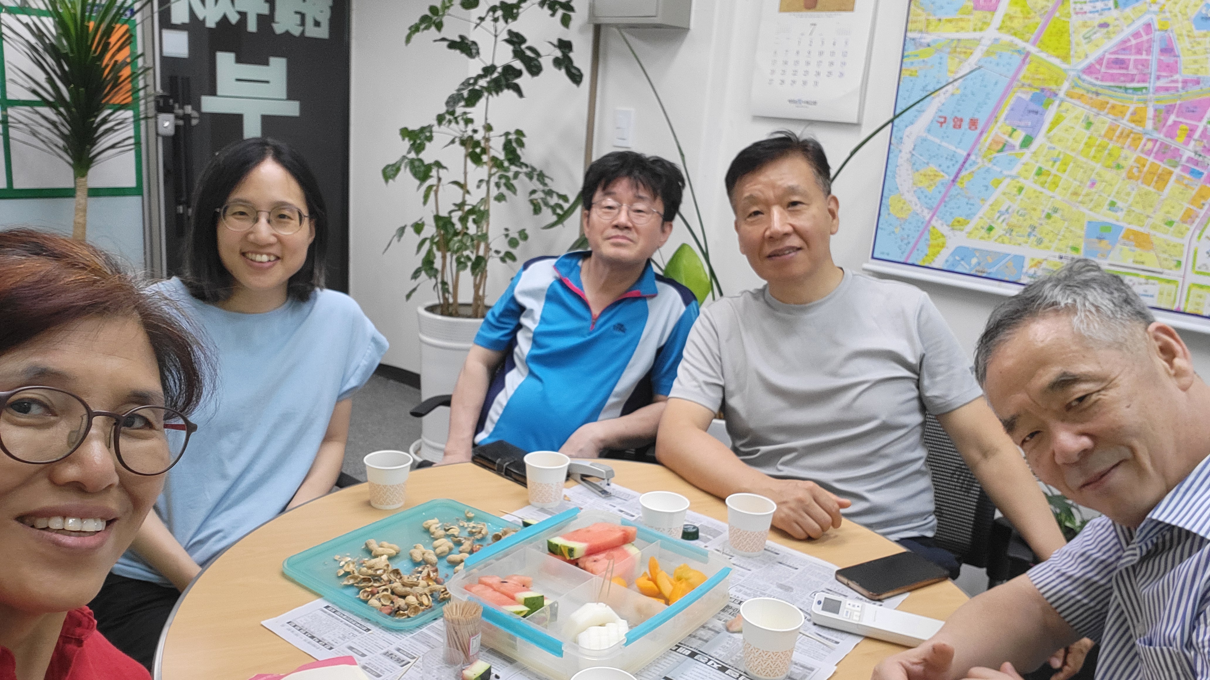 걷기를 끝내고 화기애애한 분위기 속에서 음료, 과일등을 나누어 마시고 먹으며